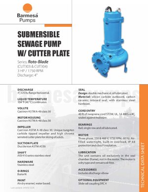Barmesa CUT Series submersible cutter pump, 3HP, 3PH, 230V, 3500RPM. With 4" flanged discharge, Cast Iron casing, Cast Iron impeller with tungsten carbide tip and high chrome serrated cutter plate, Cast Iron motor body, 420SS shaft, and double seal, SIC/SIC lower, CAR/CER upper. Pump also includes discharge elbow.