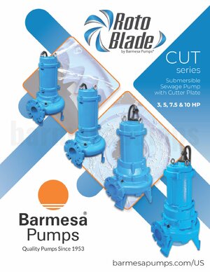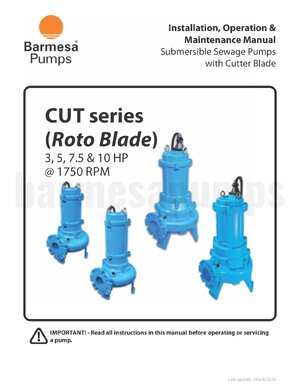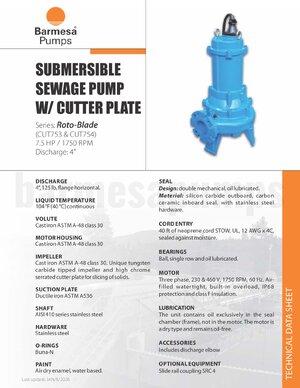 Barmesa CUT Series submersible cutter pump, 7.5HP, 3PH, 230V, 3500RPM. With 4" flanged discharge, Cast Iron casing, Cast Iron impeller with tungsten carbide tip and high chrome serrated cutter plate, Cast Iron motor body, 420SS shaft, and double seal, SIC/SIC lower, CAR/CER upper. Pump also includes discharge elbow.