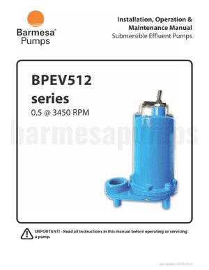 Barmesa EV submersible effluent pump, .5HP, 1PH, 115V, 3500RPM. With 2" NPT discharge, cast iron casing, cast iron impeller, cast iron motor body, and 410SS shaft.