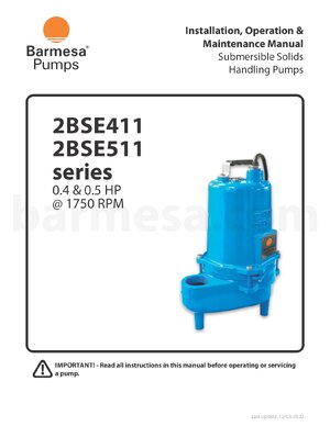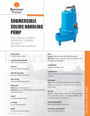 Barmesa BSE submersible solids handling pump, .4HP, 1PH, 115V, 1750RPM. With 2" NPT discharge, cast iron casing, cast iron impeller, cast iron motor body, and 416SS shaft.