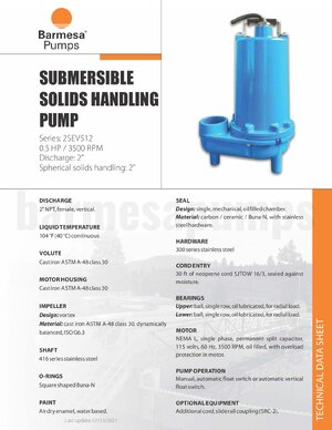 Barmesa SEV submersible solids handling pump, .5HP, 1PH, 115V, 3500RPM. With 2" NPT discharge, cast iron casing, cast iron impeller, cast iron motor body, and 416SS shaft.