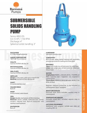 Barmesa BSE submersible solids handling pump, 11.3HP, 3PH, 230V, 1750RPM. With 4" flanged discharge, cast iron casing, cast iron impeller, cast iron motor body, 416SS shaft, and double seal.