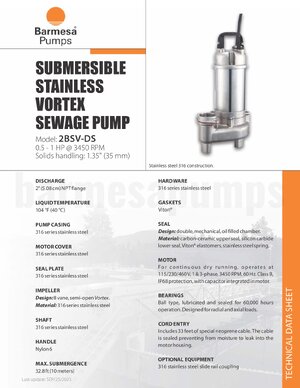 Barmesa BSV submersible stainless vortex pump, 1HP, 3PH, 460V, 3450RPM. With 2" NPT discharge, 316SS casing, 316SS vortex impeller, 316SS motor body, 316SS shaft, and double seal.