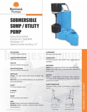 Barmesa 1/3hp 115V submersible sump/utility pump. Cast Iron construction with 416SS shaft. 1.5" NPT discharge and 10' Cable. Manual Control.