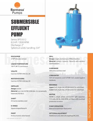 Barmesa EV submersible effluent pump, .5HP, 1PH, 115V, 3500RPM. With 2" NPT discharge, cast iron casing, cast iron impeller, cast iron motor body, and 410SS shaft.