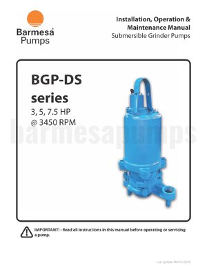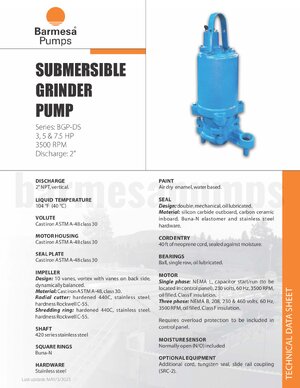 Barmesa BGP submersible grinder pump, 7.5HP, 3PH, 230V, 3450RPM. With 2" NPT discharge, Cast Iron casing, Cast Iron vortex impeller, Cast Iron motor body, 420SS shaft, and double seal.