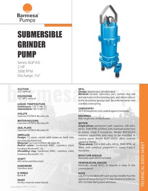 Barmesa BGP submersible grinder pump, 2HP, 1PH, 230V, 3450RPM. With 1.25" NPT discharge, Cast Iron casing, Cast Iron vortex impeller, Cast Iron motor body, 420SS shaft, and double seal.