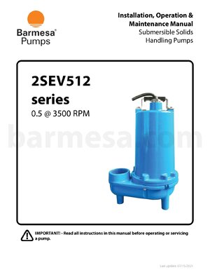 Barmesa SEV submersible solids handling pump, .5HP, 1PH, 115V, 3500RPM. With 2" NPT discharge, cast iron casing, cast iron impeller, cast iron motor body, and 416SS shaft.