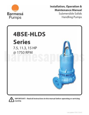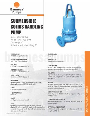 Barmesa BSE-HLDS submersible solids handling pump, 7.5HP, 3PH, 230V, 1750RPM. With 4" flanged discharge, cast iron casing, cast iron impeller, cast iron motor body, 416SS shaft, and double seal.