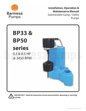 Barmesa 1/3hp 115V submersible sump/utility pump. Cast Iron construction with 416SS shaft. 1.5" NPT discharge and 10' Cable. Automatic control with vertical float.